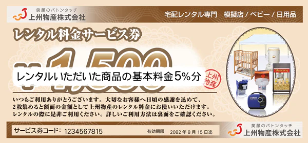 サービス券の金額はレンタルいただいた商品の基本料金5%分となります。